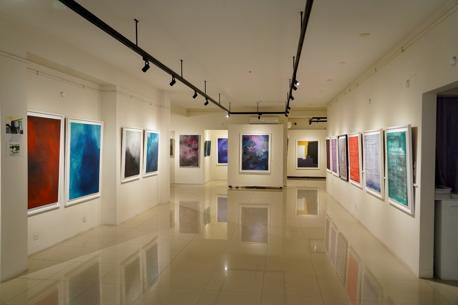 The paintings in the exhibition were mostly divided by series: the Moshari series was primarily acrylic‑based, while the meditative collection contained more oils.