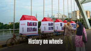 Pedestrians paused in silence, bus conductors gazed from their windows—some recognising familiar faces, others lost in painful memories. A powerful street exhibition in Dhaka displayed haunting images from Bangladesh’s July 2024 Mass Uprising, bringing the city’s recent trauma into public view. “While traditional galleries in Dhaka often cater to only a certain class of people, a floating street exhibition was envisioned as a way to bring art into public spaces—making it accessible to people from all walks of life,” says Taslima Akhter, the acclaimed photojournalist and activist who organised the event alongside Pathshala South Asian Media Institute. On August 11-12 of 2025, five exhibition vans set out from the Raju Memorial Sculpture at Dhaka University, bringing the story of the July Uprising to the streets of Dhaka, covering most of the significant spots where the revolution took place. The key aspects of this floating exhibition were to demonstrate the participation of students, professionals, everyday people—especially women—and the significance of D-Day, August 5. Creatively set up on vans, photographs and artworks were mounted on temporary house-like structures with striking red roofs, drawing the attention of day labourers, students, office workers, chauffeurs, and people from all walks of life—just as they once came together to free the country from the 15-year authoritarian regime under Sheikh Hasina’s government. The vans stopped at key sites of the uprising, letting visitors engage with the images. Organisers admitted the street exhibition was challenging—but they were committed to reaching as many people as possible. Originally planned to honour the martyrs on the uprising’s first anniversary, the exhibition was postponed due to logistical challenges. “What you see now is a collection of the works we were able to gather, with consent from the participating photographers,” said Taslima. She further said how we’re not only fighting the effects of fascist ideology in our society, but also confronting it within our own thought processes. In the past, many artists and photographers hesitated to share their work—uncertain whether to publish without captions, or anxious about choosing the right words. But now, we’re seeing more and more artists overcome that fear, driven by a collective urge to tell the truth through their work. When asked about the downside of everyone having a camera in their hands today, Taslima shared a different perspective. On the contrary, she explained how portable devices have empowered not just photographers but everyday people to document history like never before. If it weren’t for ordinary citizens, much of the horror of the July revolution across the country would have gone unseen. What was once a tool for personal use has now become a powerful instrument for capturing and sharing the truth. Exhibitions like this mark a crucial shift in the power dynamics of information. They democratise memory, ensuring the story of the revolution belongs to everyone—not just a privileged few. They also remind us that art and photography are powerful tools of resistance and collective remembrance. Written by Fariha Hossain Photo: Md. Rasel Ahmed