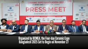 The Ceramic Expo Bangladesh 2025 is set to begin on November 27 at the International Convention City Bashundhara (ICCB), Kuril, Dhaka. The four-day international ceramic fair—one of Asia’s most prominent—is being organized by the Bangladesh Ceramic Manufacturers and Exporters Association (BCMEA). For the fourth time, this world-class exhibition on ceramic raw materials, machinery, and technology will feature participation from 300 brands representing 135 companies from 25 countries, including Bangladesh. In addition, 500 international delegates and buyers will join the event. The expo will also include three seminars, a job fair, B2B and B2C meetings, raffle draws, attractive gifts, live demonstrations, spot orders, and opportunities for launching new products. At a press conference held today, November 23, the Dhaka Reporters Unity auditorium in the capital, BCMEA President Moynul Islam shared these details. In addition, Fair Committee Chairman and BCMEA General Secretary Irfan Uddin spoke, highlighting various aspects of the expo. Also present at the event were BCMEA Senior Vice President Md. Mamunur Rashid, FCMA; Senior Vice President Abdul Hakim Suman; Vice President Rasheed Mymunul Islam; and Director Mohd. Ziaul Hoque Zico. The press conference announced that on November 27, the expo will be formally inaugurated at the ICCB by Commerce Adviser Sheikh Bashiruddin. In addition, on November 29, Foreign Affairs Adviser Mohammad Touhid Hossain will attend a special segment of the expo as the chief guest. BCMEA President Moynul Islam said that more than 70 ceramic tableware, tiles, and sanitary ware factories have already been established in the country. The annual sales volume in the local market is approximately Tk 8,000 crore. Over the past ten years, production and investment in the ceramic sector have grown by nearly 150 percent. Bangladesh exports ceramic products to more than 50 countries worldwide, earning around Tk 500 crore annually. Export earnings in this sector are increasing, as is investment. Many countries, including major ceramic-producing nations such as China and India, have shown interest in investing here. The sector has attracted investments of over Tk 18,000 crore, and it directly and indirectly provides employment to nearly five lakh people. Fair Committee Chairman and BCMEA General Secretary Irfan Uddin said that due to superior quality and attractive designs, the demand for Bangladesh-made ceramic products is increasing in the global market. Not only that, new markets are also emerging. He added that Ceramic Expo Bangladesh 2025 is the country’s fourth and Asia’s largest international exhibition of its kind. Ceramic manufacturers, exporters, and suppliers are getting the opportunity to showcase their new products, modern technologies, and expertise to a global audience. Along with marketing domestic ceramic products, the expo will also help raise awareness about their use. Irfan Uddin said that they believe the use of technology in the ceramic industry will completely transform its future. Through automation, advanced digital printing, robotic handling, and high-quality production lines, manufacturing will become faster, more precise, and more cost-effective. He added that smart tiles and sensor-integrated products are gaining popularity worldwide, and this trend will soon influence the Bangladeshi market as well. The expo, he noted, will create a vital link between these technologies and local manufacturers. The four-day exhibition will remain open to visitors, buyers, and participants free of charge every day from 10 a.m. to 6 p.m. Sheltech Ceramics is the principal sponsor of the fair, while DBL Ceramics, Akij Ceramics, and Meghna Ceramic are the platinum sponsors. In addition, the gold sponsors include Mir Ceramic, Abul Khair Ceramic, HLT DLT, and Sacmi. Written by Tasmia Chowdhury