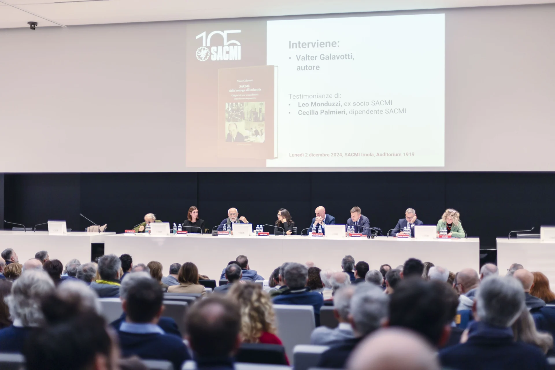 In a packed Auditorium 1919, people gathered to listen to the author of the book, Valter Galavotti, and two former and current SACMI employees, Leo Monduzzi and Cecilia Palmieri. The event was also attended by local institutions: acting president of the Emilia-Romagna Region, Irene Priolo, was there, together with the mayor of Imola, Marco Panieri, highlighting how the ‘SACMI model’ is a crucial part of Imola, the Region and, indeed, Italy’s industrial, economic and social heritage. The meeting ended with words from the President of Legacoop Nazionale, Simone Gamberini.