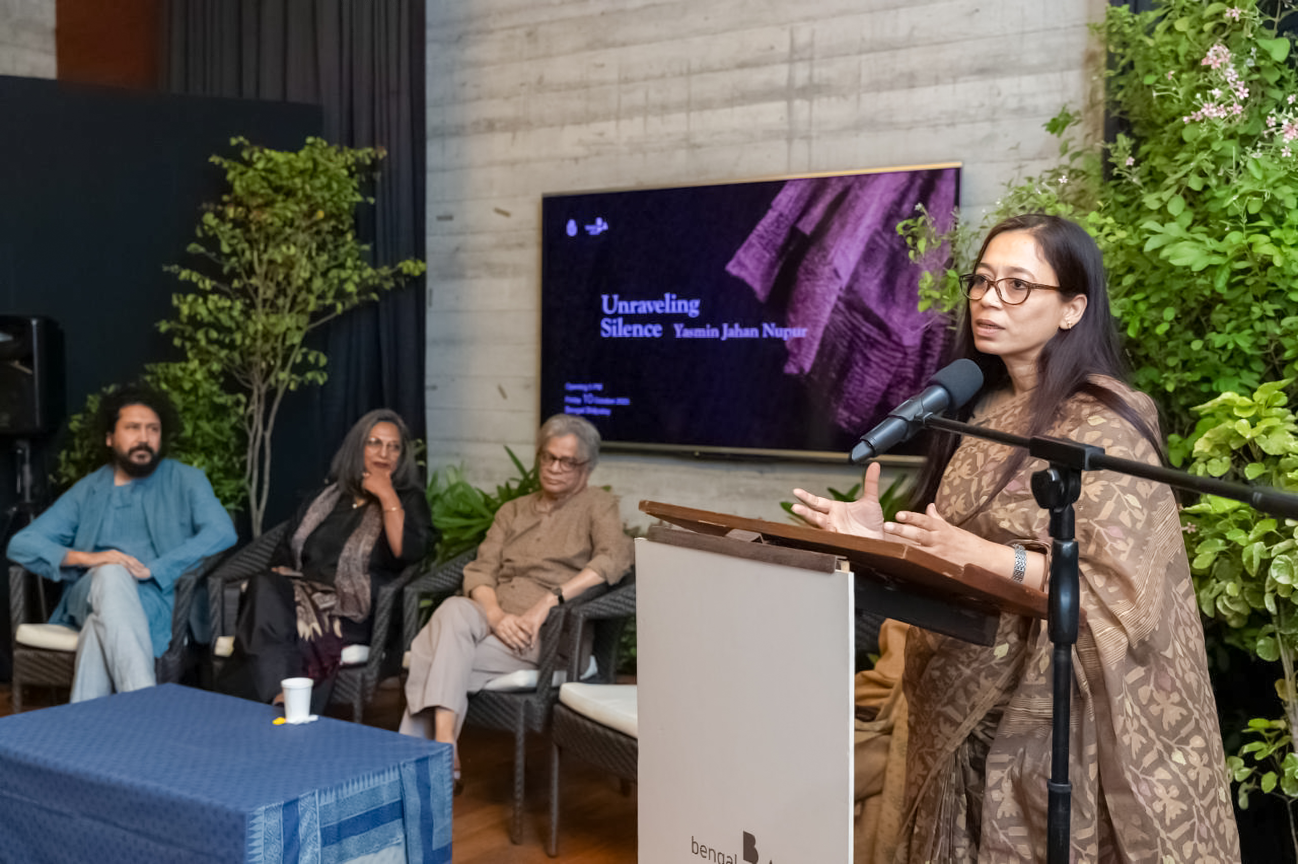 Yasmin Jahan Nupur not only hails a heavy portfolio of glorious works but also became a household name in the international galleries. This second solo exhibition is Nupur’s careful documentation and a commitment to preserving the vanishing heritage of Bangladesh’s textiles. As visitors walk through the gallery, they are compelled to stop, gaze, and ultimately begin to unravel the silences behind each piece. “Even though the voice may be muted or just a soft whisper (mridu shor), the visitors must take the time to truly listen,” quotes curator Tanzim Wahab.