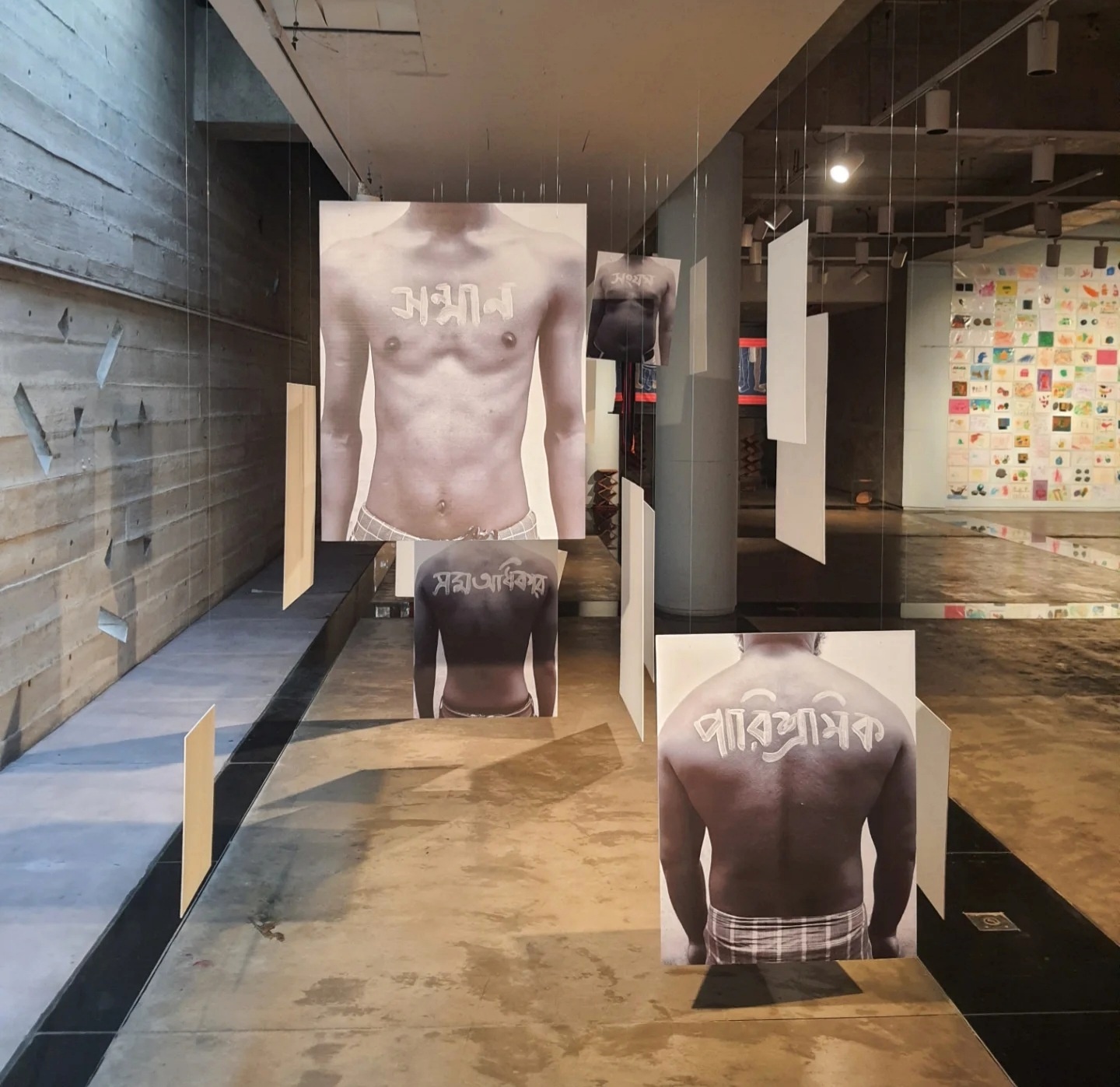 For example, a striking, suspended photographic installation that features suspended images of men, where words such as “violence,” “wages,” “women’s labor,” and “possibility” are inscribed on their bodies. The images hang from the ceiling like a suspended interrogation. Are all these accusations aimed at men, women, or society at large?