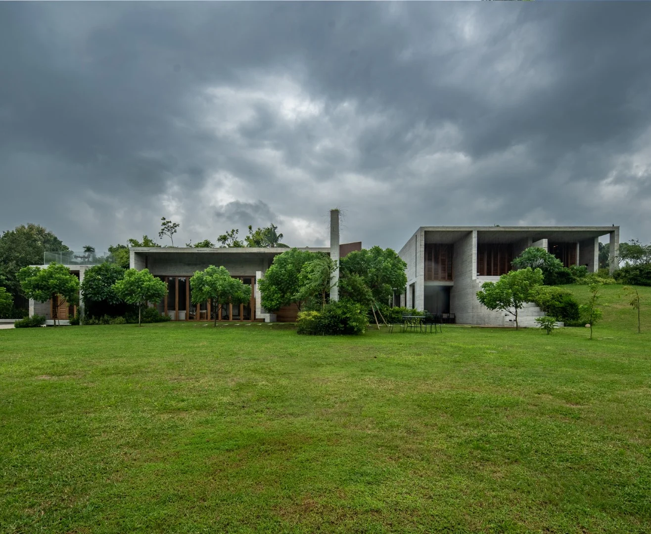 Material choices are deliberate: exposed concrete for structure, mahogany for doors and windows, matte tiles for floors, and grill-less glass for uninterrupted light.