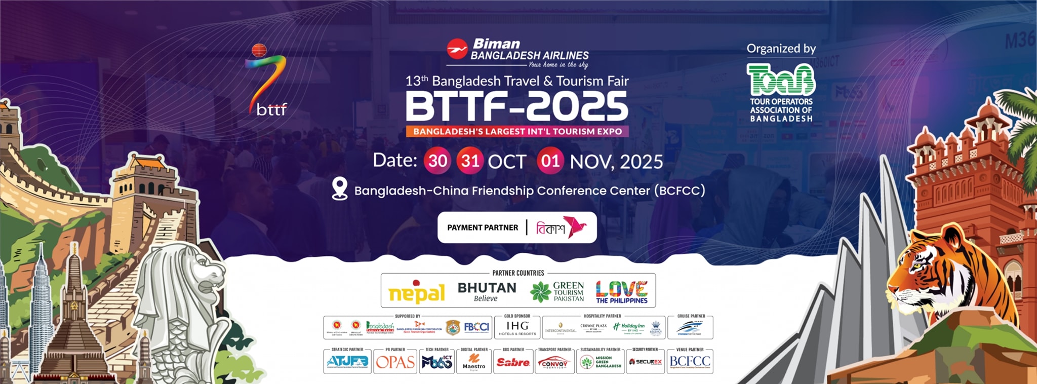 Biman Bangladesh Airlines is the title sponsor of BTTF 2025, joined by IHG Hotels & Resorts as the gold partner and bKash as the payment partner, with cashback offers available for visitors purchasing entry tickets via bKash.