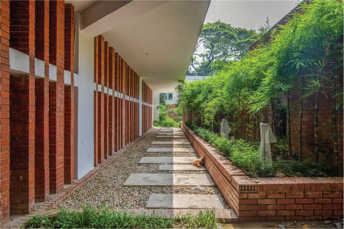 To strengthen the complex, modern materials like reinforced concrete and rods were used around it but not to take away its vernacular architectural roots from it. For example, thatched roofs of huts are trussed up with external support struts or buttresses made of very basic material but with superior compressive strength—bamboo. However, the aluminum beams propping up the surrounding top floor serve that symbolic role. The complex was designed with one mission in mind: to give visitors the impression that they are experiencing a piece of the Chattogram Hill Tracts right in the heart of bustling Dhaka. A sloped garden and a fountain mimicking the trickling down of water from a hill face welcome visitors.