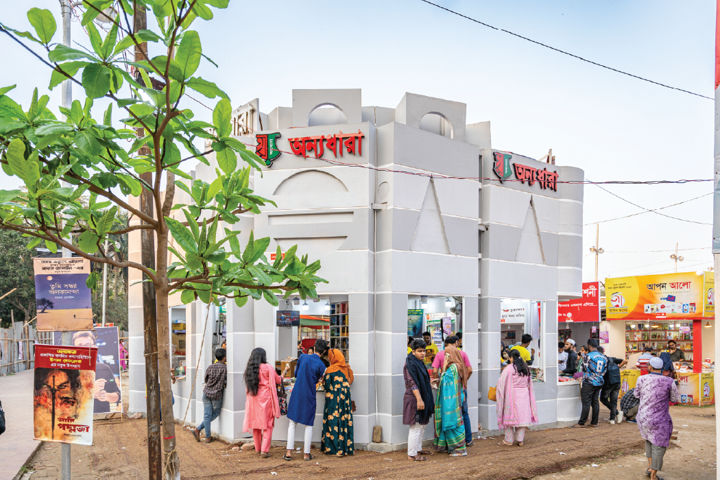 One of the highlights of this year’s book fair is the pavilion by Iti Prokashon, titled ‘Ziar Bari’ (Zia’s House), named after Ziaur Rahman, a prominent army chief, freedom fighter and politician who served as the sixth President of Bangladesh from 1977 to 1981. A key figure in the country’s War of Independence, Zia’s name has often been sidelined in public discourse and textbooks due to the agendas of the previous autocratic regime. In contrast, Onnodhara Prokashon transformed its pavilion into a representation of the Bangladesh Parliament House. The sight of these two distinct symbols coexisting on the same ground truly captivated visitors. Afsar Brothers gave their pavilion a harmonious blend of heritage and functionality, making it an inviting space for book lovers while paying homage to Bengal’s rich architectural traditions. The structure follows a half-timbered design with exposed wooden beams and white infill panels, resembling classic Bengali rural or zamindari house styles.