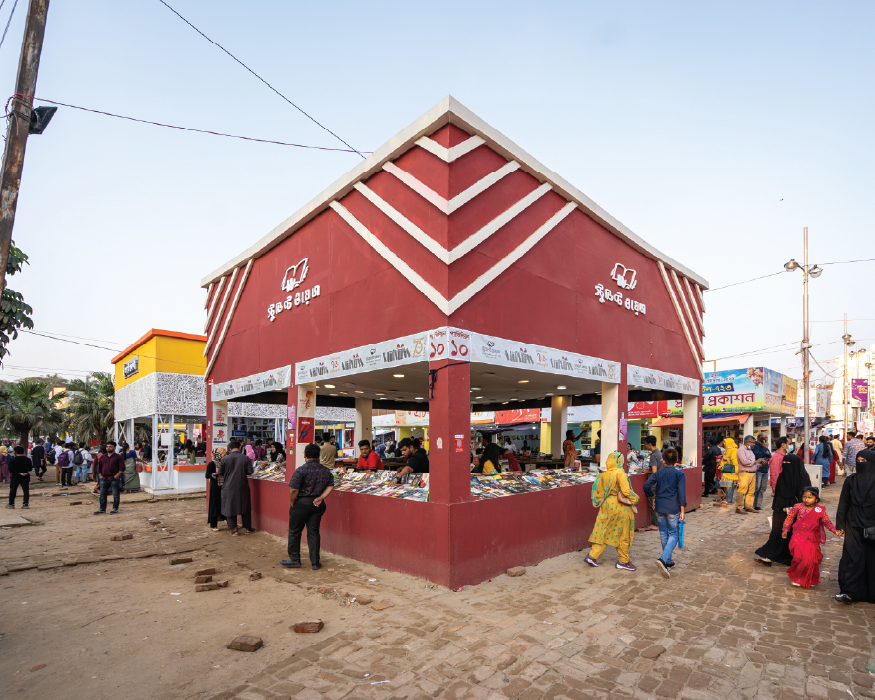 The best pavilion design goes to Batighar, designed by artist Shahinur Rahman. The triangular front featured a stained-glass-like panel with motifs from Nakshi Kantha and Patachitra, reflecting Bengali folk art. Inside, a red dome element, inspired by a Chhoto Sona Mosque, highlighted local heritage. The steeply pitched roof with exposed red clay tiles resembled traditional Bangladeshi huts. For its artistic excellence, Batighar won the Kayum Chowdhury Memorial Award for best pavilion in this year.