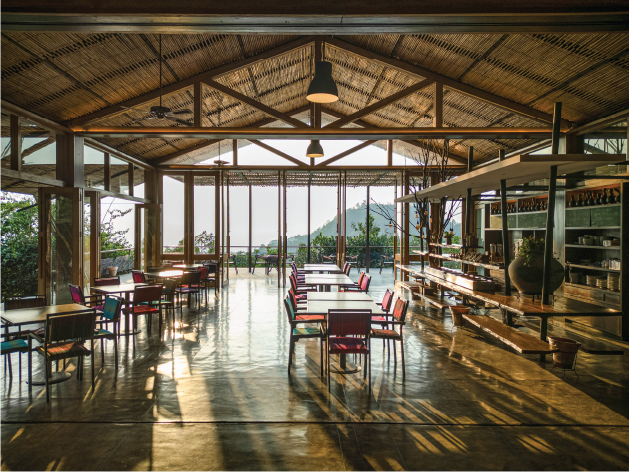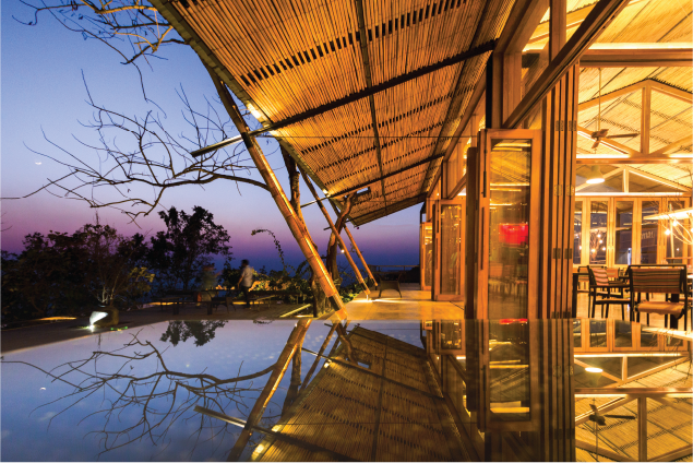 The resort is named after this story, with “Sairu Point” marked by entwined trees on a hill, symbolizing their love. The Sairu Hill Resort draws its name and logo from this legend, preserving its memory for visitors to honor. Sairu is a contemporary eco-resort that blends modern luxury with natural harmony. Designed with sustainability in mind, it incorporates local materials like stone and bamboo to create a rustic yet refined aesthetic that seam lessly integrates with the surrounding environment. The cottages at Sairu are thoughtfully priced, offering options tailored to your preferred view. Each cottage features a private balcony and a spacious washroom with a unique, nature-facing concrete bathtub—a rare luxury in the country. The rooms are generously sized and adorned with colorful jute rugs, bamboo curtains, and furniture crafted from tree logs. A standout piece is the giant coffee table, made from a single slice of a tree trunk. Modern amenities such as toiletries, skincare essentials, laundry services, and safes ensure a comfortable stay.