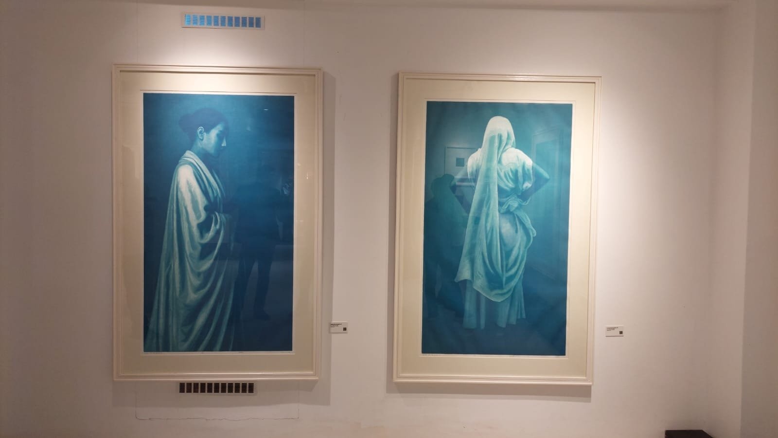 As noted by Gallery Plat-forms, in ‘Beyond the Veil’, Shakil revives the long-format woodcut to explore a world both intimate and exclusive. Through sweeping panels in amber, midnight blue, and stark monochrome, a woman emerges through fabric, fold and shadow.