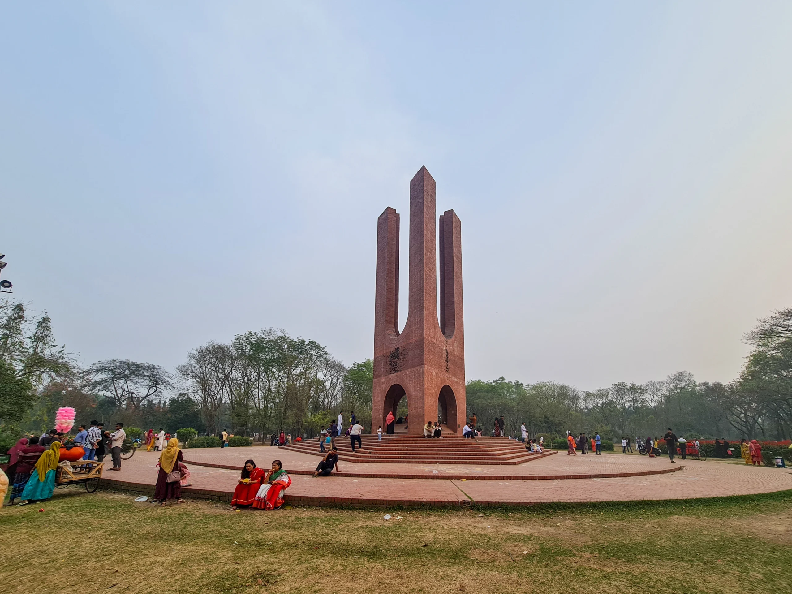 The foundation of the monument is designed with a diameter of 52 feet, symbolizing the year 1952, the base for all future achievements. To honor the unforgettable dignity of 1971, the three soaring pillars rising from the base are 71 feet high. The eight steps leading up to the base symbolize the eight significant years of Bangladesh’s freedom movements post-partition: 1947, 1952, 1954, 1962, 1966, 1969, 1970, and 1971. These years are a tribute to the struggles and movements that shaped the nation. The triangular-shaped, rigid structure of the monument serves as a symbol of resilience, honoring the national heroes who fought and died for the language and the land.