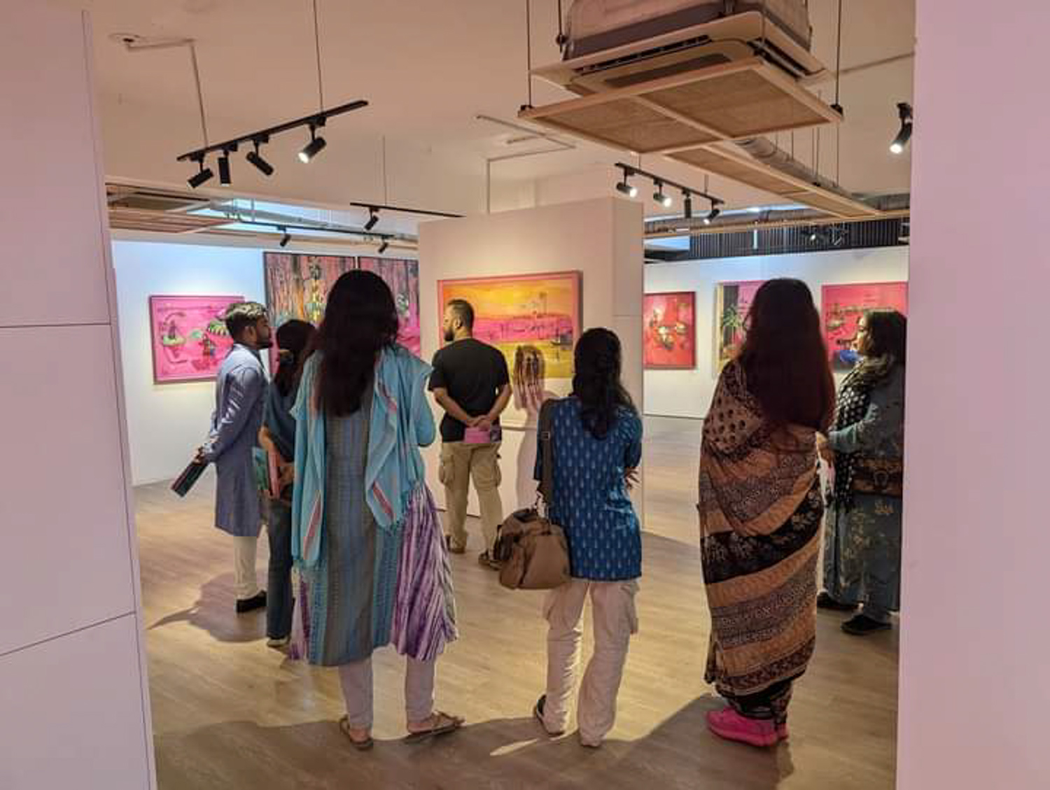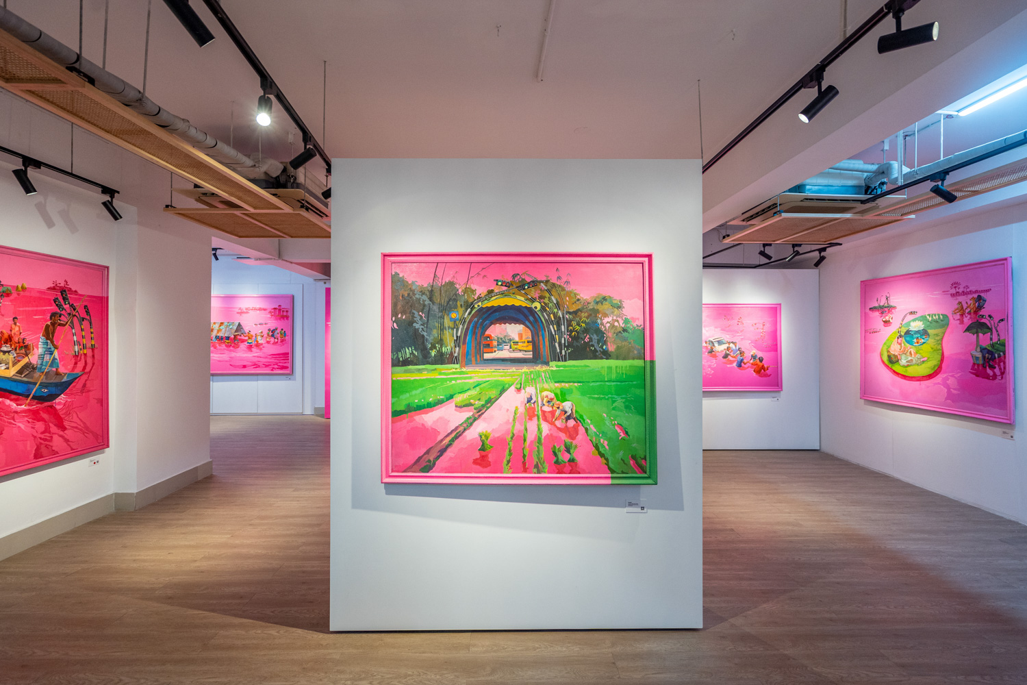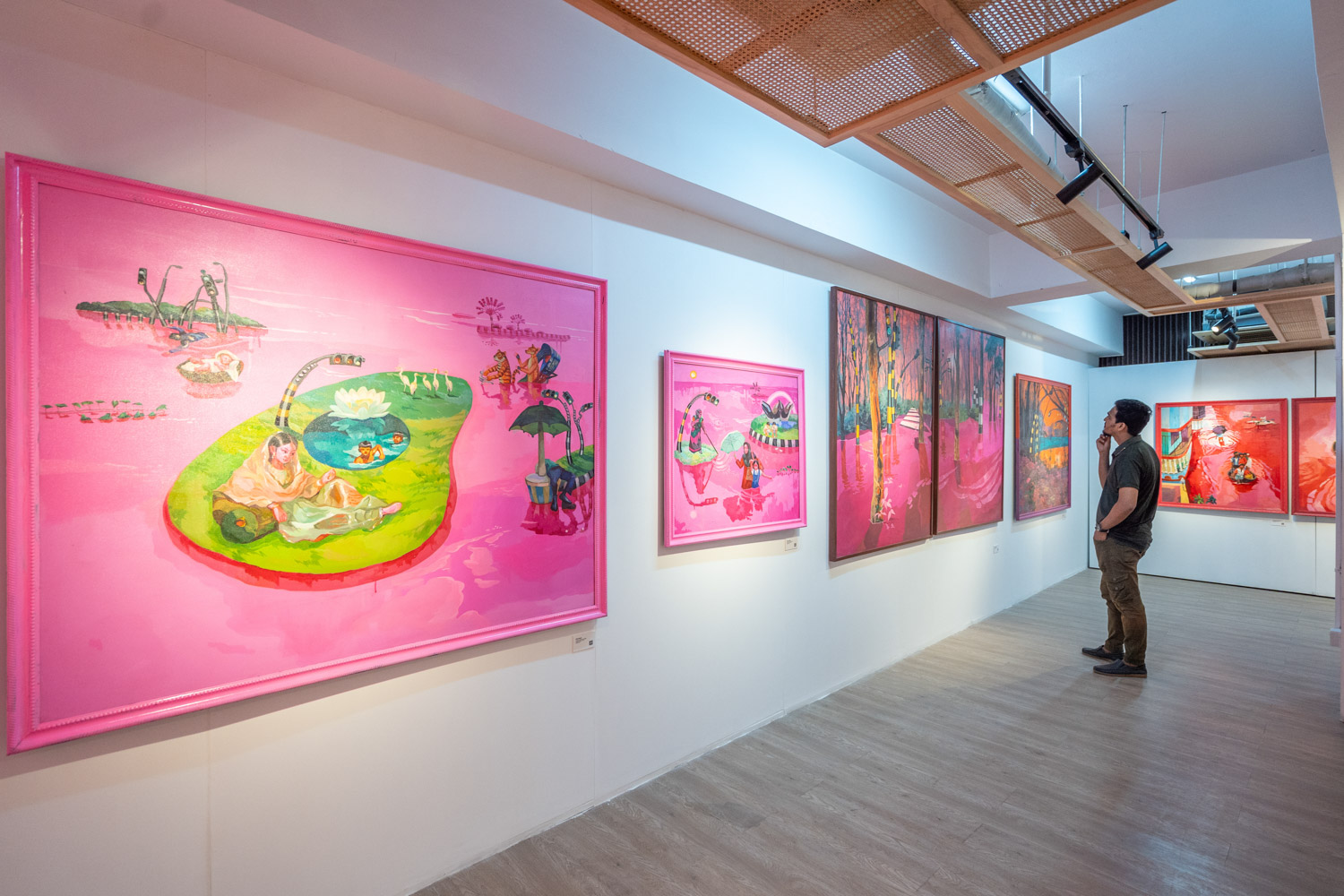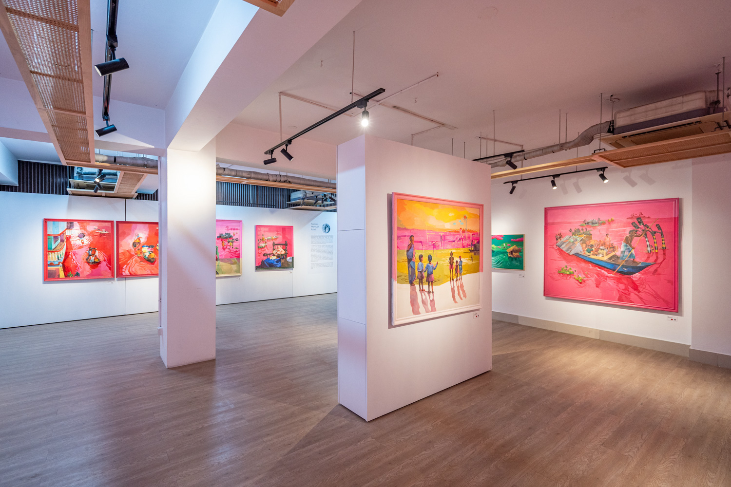 The exhibition is arranged to showcase the shifting scales of transitions. It moves from intimate depictions of flood-affected communities to broader, more abstract landscapes, highlighting the internal and external journey of displacement and environmental degradation. Each painting extends beyond the frame, symbolizing the magnitude of the crisis—far too vast to be confined to canvas.