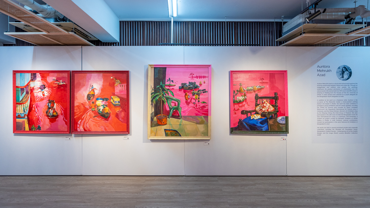 Auntora Mehrukh Azad, a visual artist, focuses on searching the evolving relationship between nature and urban life. Through an exaggerated, artificial colour palette, her creation emphasizes on the gradual dominance of urbanization over the natural world. She has earned both MFA and BFA in Drawing and Painting from the Faculty of Fine Art, University of Dhaka.