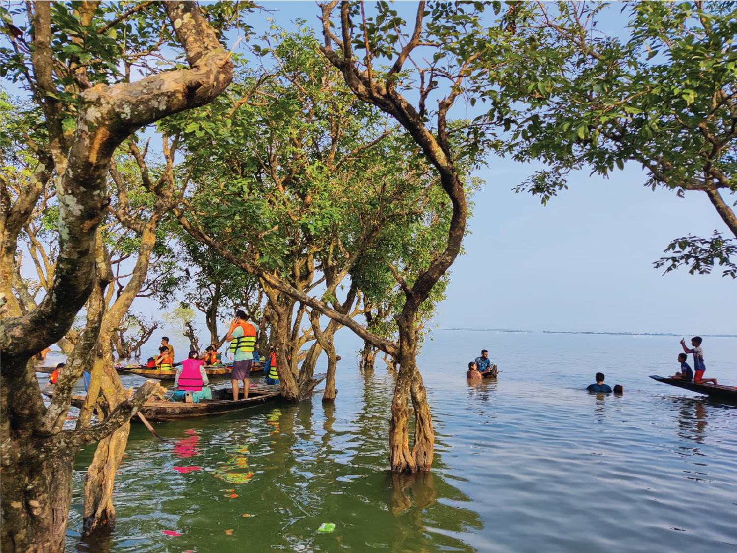 Spaces like Tanguar Haor always have their own stack of mythical tales and different kinds of histories. One such thing that goes hand in hand is music. The original stories of local music genres and the backdrops of many legendary creations are closely related to water. One such is a type of folk music called “Ghetu Gaan”, which originated from such types of wetland areas where parts of the year were dry and everyone was busy working in the fields, taking care of livestock etc. and had nothing much to do during the entire monsoon, is when the inhabitants, especially the boatmen and local poets and musicians, organically started crafting such music. Another very interesting fact about this art practice is that teenage boys were dressed up as girls to perform and dance in Ghetu Gaan. In fact, the plot of the last ever movie made by the legendary Bangladeshi novelist and filmmaker Humayun Ahmed, “Ghetuputro Komola,” revolves around the practice of Ghetu Gaan. The practice itself has a lot of very interesting and tragic histories. Although this particular practice is almost extinct now, other kinds of music are still an integral part of our lives. Tanguar Haor is also one of the largest natural water reservoirs in South Asia. This natural wonder is the second largest freshwater wetland in Bangladesh spread over an area of about 126 square kilometres, and is a reservoir of trees, fish, birds and natural biodiversity. More than 30 fountains from the world’s rainiest Meghalaya hills merge in this haor. The Tanguar Haor is called the mother of all haors and the mother of fisheries as well, with a catchment area of 12,665 hectares (31,275 acres) of land. Tanguar Haor is the largest wetland consisting of 51 haors in 18 mauzas of two upazilas (sub-districts) in Sunamganj. 30 square kilometers of water-logged main haor and the rest is residential and agricultural land. There are 88 villages in and on the banks of the Haor area. When the water dries up in the winter season, the banks (‘kanda’ in local language) of about 24 beels wake up, only the inner part of the kanda (banks) has the original beel, and the local farmers cultivate winter crops and boro paddy in the dry part. During this time the area was also used as a pasture. Migratory birds take shelter in the high banks (kanda) of Haor, submerged in water during monsoons. The haor is also known in Bangla as “Naikuri Kanda’s Chaikuri Beel” to the local people. IUCN is working to protect the biodiversity of this region.