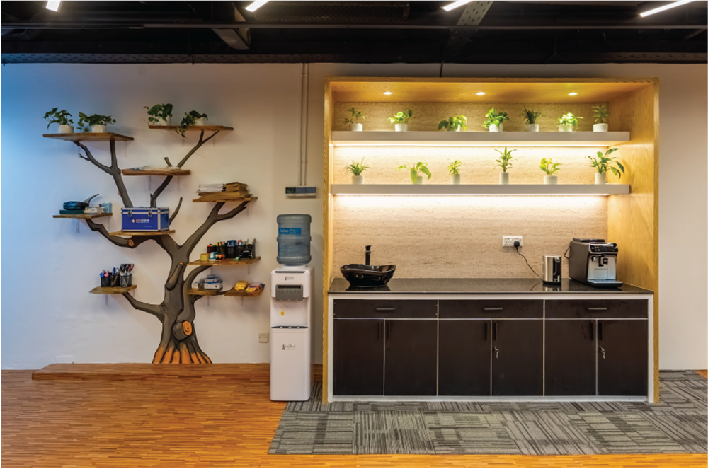 Meanwhile, the furniture choices favored light-colored wood and clean lines to complement the architecture without overwhelming it. Lush green walls filled with planters further softened the industrial base, offering breathing spaces that look and feel alive.
