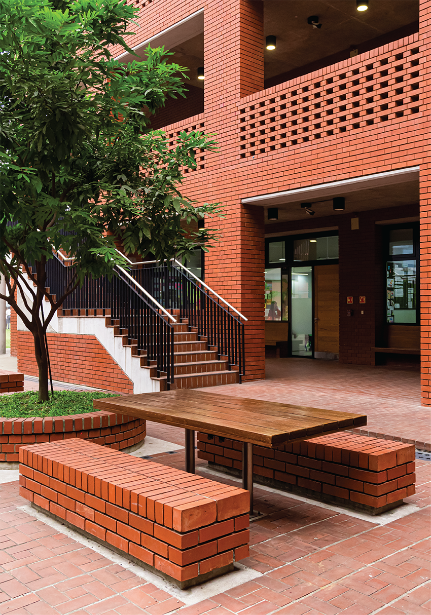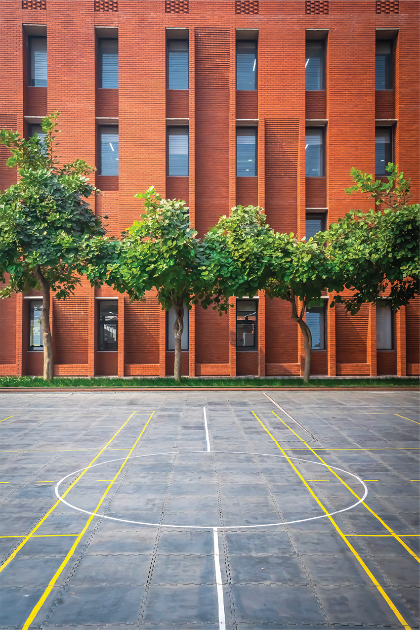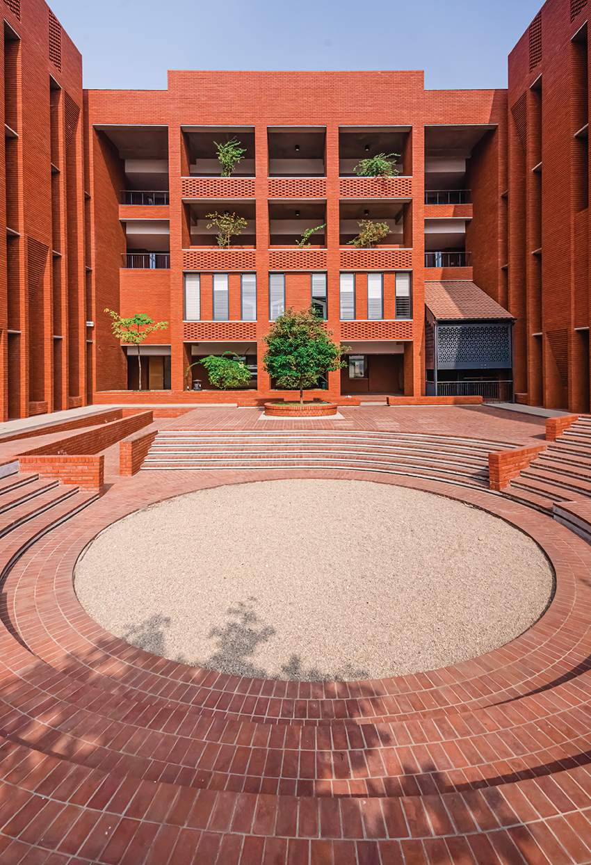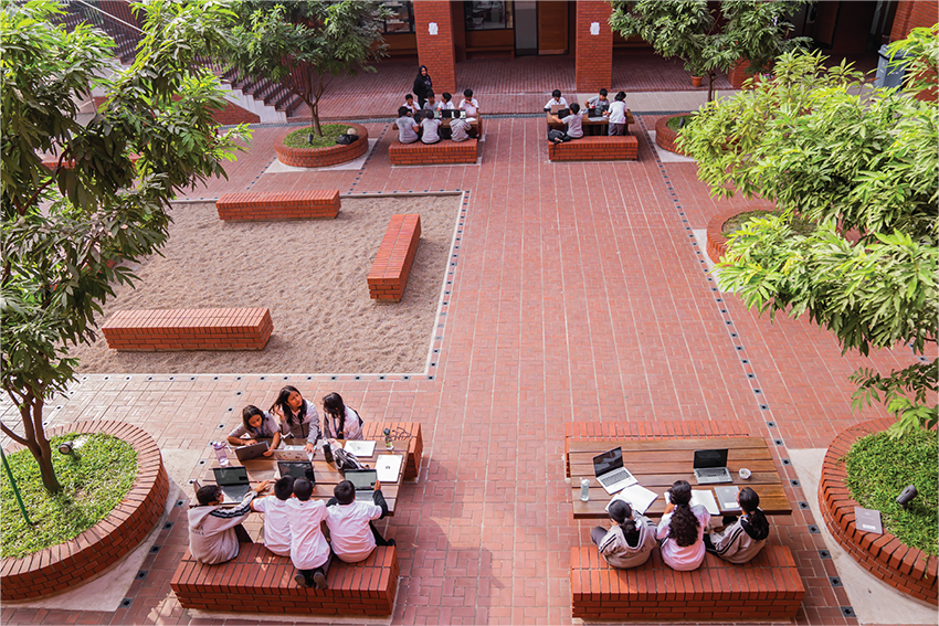 A central amphitheatre serves as a space for performances and gatherings. The adjacent Maidan, a large open playground, accommodates student activities, serving recreational and social functions. Brick buildings surround these shared areas on a planted base, offering unobstructed views of the Maidan from all directions. The Maidan functions as the campus’s central point, reflecting the spirit of ancient Buddhist Mahaviharas. These elements collectively support an environment where the physical space contributes to the educational process.
