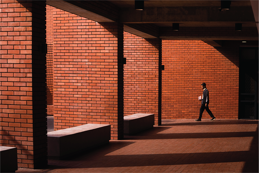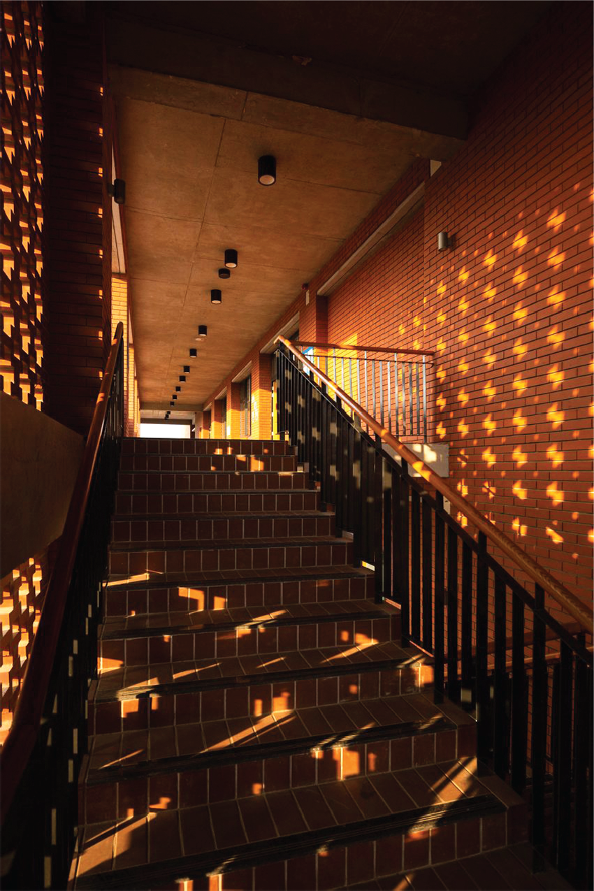 Classrooms are oriented to minimise solar gain in summer, with external walkways and adjacent buildings providing passive solar shading from the morning sun throughout the year. This ensures adequate daylight and outdoor views. Architects designed these spaces for passive heating and shading year-round to minimise energy consumption. This climate responsiveness was achieved through extensive sun pattern analysis and wind flow direction studies, optimising light and ventilation. The academy’s character reflects many original Buddhist universities in Bangladesh. It is defined by the massing and materiality of brick buildings located on a sculpted and planted landscape base surrounding the central Maidan.